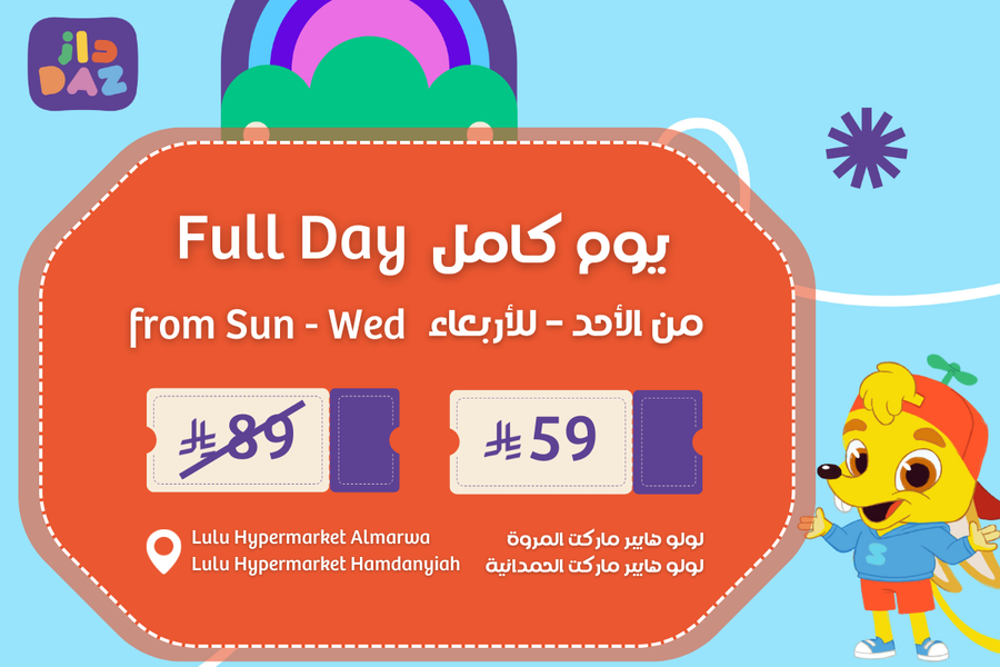 تشمل الدخول ليوم كامل من الأحد إلى الأربعاء في فروع لولو هايبر ماركت المروة ولولو هايبر ماركت الحمدانية وإستخدام لجميع مرافق الألعاب بالإضافة لحضور الأنشطة اليومية والتي تكون مقسمة على 4 أوقات خلال اليوم وهي كالاتي: