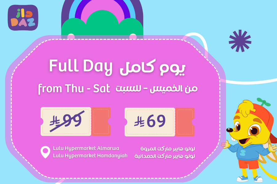 تشمل الدخول ليوم كامل من الخميس للسبت في فروع لولو هايبر ماركت المروة ولولو هايبر ماركت الحمدانية وإستخدام لجميع مرافق الألعاب بالإضافة لحضور الأنشطة اليومية والتي تكون مقسمة على 4 أوقات خلال اليوم وهي كالاتي: